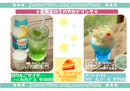 ![]() “青りんごサイダー”と“空色クリームソーダ” これはもう、ルイママの夏には無くてはならないドリンクメニューとなっております メニューを開いたときに、出てこなかったら それだけでなんだか“しょんぼり”した夏になってしましそうな・・・ そんな気さえしてしまう、もう“夏休みのお友達”みたいな相棒たち★ この二つを組み合わせると、昨今はやりのレトロなクリームソーダ メロンソーダ+アイスクリーム+チェリー に、ほど近いものが出来上がるわけで・・・ そんなのもいいなぁ〜と思ったわけですが ここはあえてのっからずに 従来の路線で突き進みます レトロな方のクリームソーダが飲みたくなったら その時は、また違うお店で・・・そして私も よそのお店で堪能させていただきたいと思います (^^♪ |