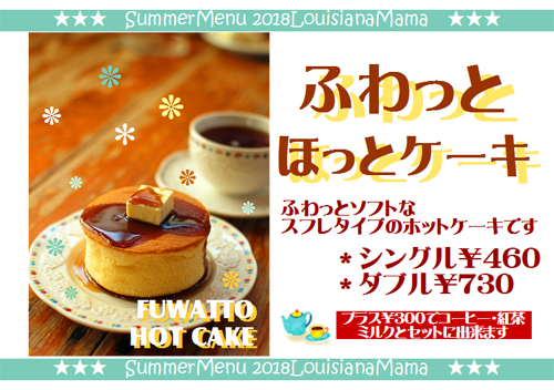 ![]() ちよっとわかりにくいかなぁ・・・と迷いつつ付けた “ふわっとほっとケーキ”のネーミング あれから一年余りたち、もうすっかりお店になじんだ様子です メニューの中には“ふつうのホットケーキ”もあり みなさん少し悩まれるようですが ここしばらくは“ふわっと”が優勢です 本来夏メニューには向かないものですが もうすでにリピーターさんが多くて のせない訳にはいかないようです ふわふわなホットケーキの上でとろける バターとメイプルシロップ テーブルの上の、なんとも牧歌的な雰囲気に ついつい“うっとり”してしまいますが・・・ これ、ぜったいにアツアツの方がおいしいです 二段重ねの“ふわっとダブル”も人気ですよ |